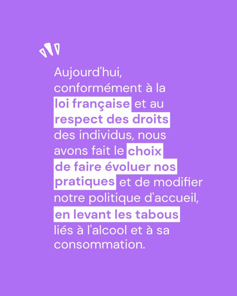 Notre intention ici, c’est d’acculturer l’ensemble des acteurs à cette démarche novatrice. Lever les préjugés et montrer que l’usage de l’alcool peut aussi faire partie des moments de joie et de partage, à partir du moment où il est encadré et régulé. Plutôt que proscrire et montrer du doigt, nous venons lever un tabou et reconsidérer la question des droits, pour que chacun·e se sente chez soi et libre de ses actes.