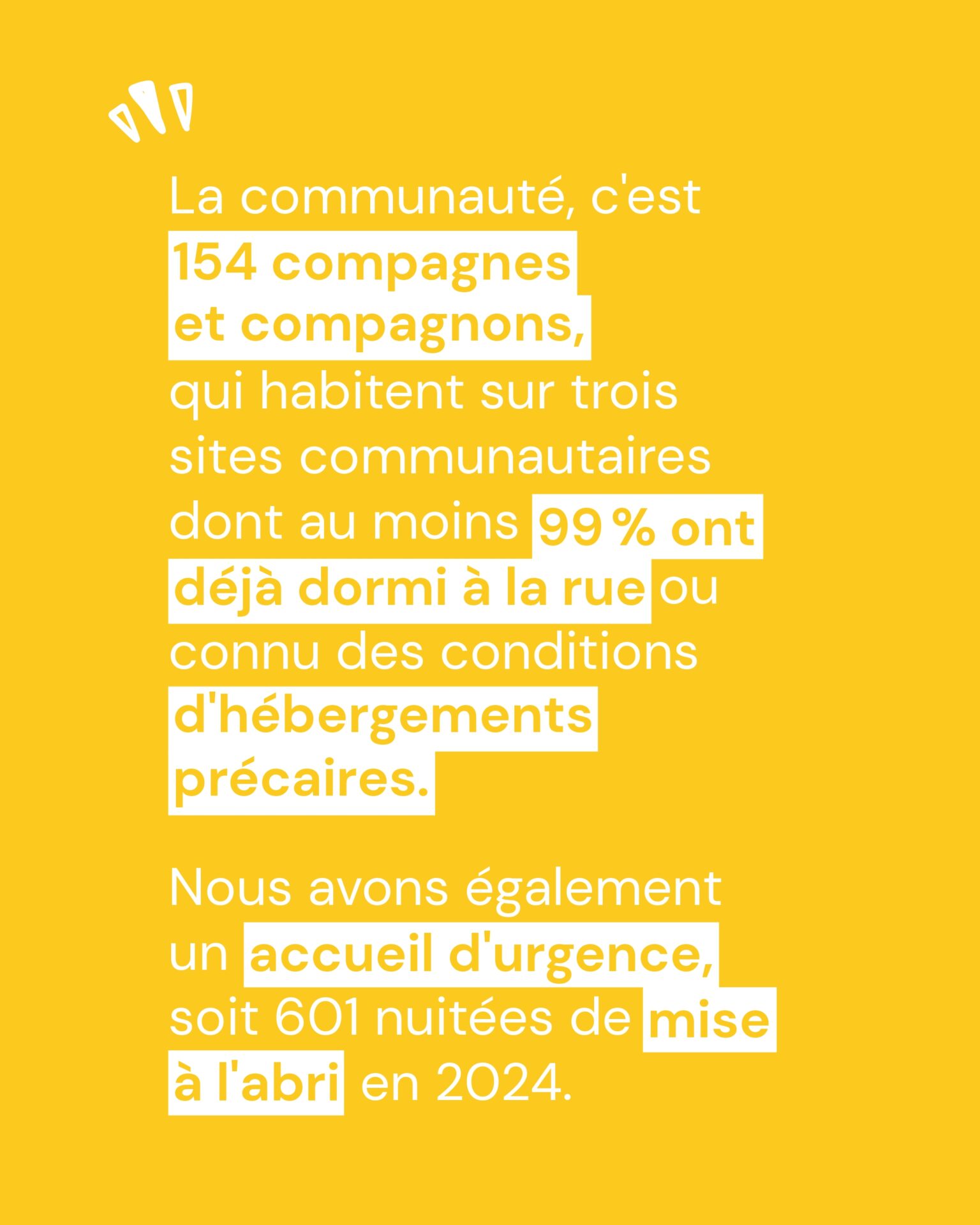 Parmi les 154 personnes vivant dans nos sites communautaires, 99 % ont connu l’errance, l’indifférence, la violence de la précarité.